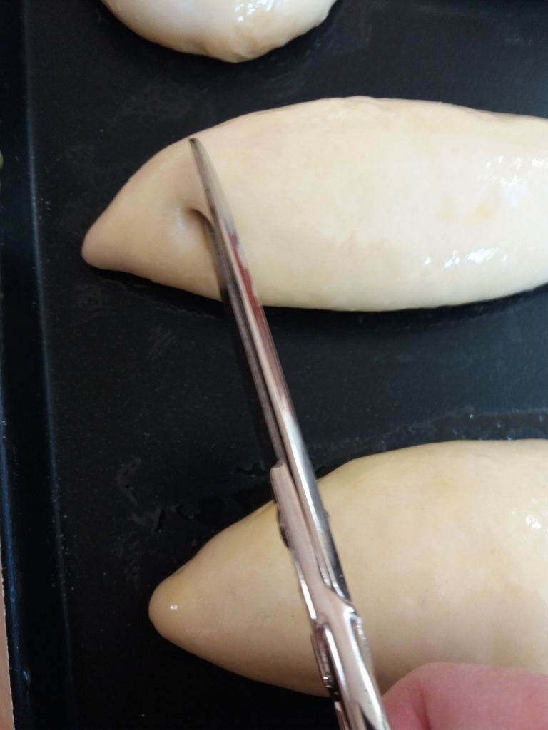 - Tremper le bout d'une paire de ciseaux dans l’œuf et parallèlement au plan de travail, couper petit à petit en partant de l'extrémité du pain, jusqu'à l'autre extrémité sans jamais ôter les ciseaux de la pâte ( en glissant dans la pâte ).